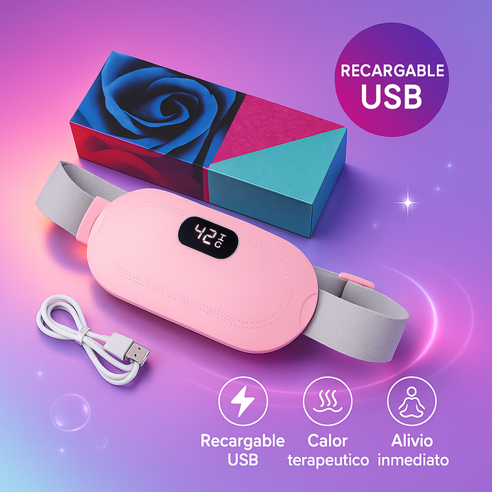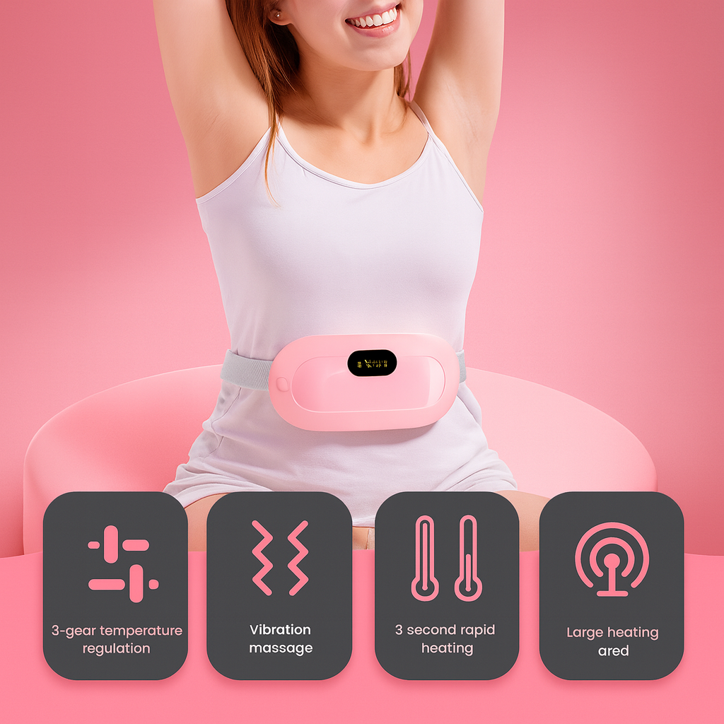 Despídete de los cólicos menstruales con este cinturón masajeador inalámbrico que combina calor y masaje vibratorio para un alivio discreto y efectivo en cualquier lugar.