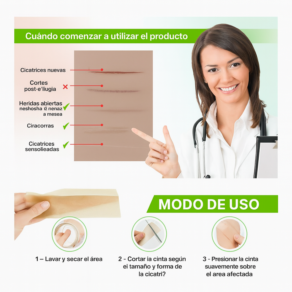 Respuesta 1: Para usar las tiras, primero limpia y seca bien la zona de la cicatriz. Luego, coloca la tira de silicona sobre la cicatriz asegurando que quede bien adherida. Se recomienda usarla al menos 12 horas al día y se puede llevar incluso bajo la ropa. Después de usarla, lávala con agua tibia y jabón neutro para poder reutilizarla.